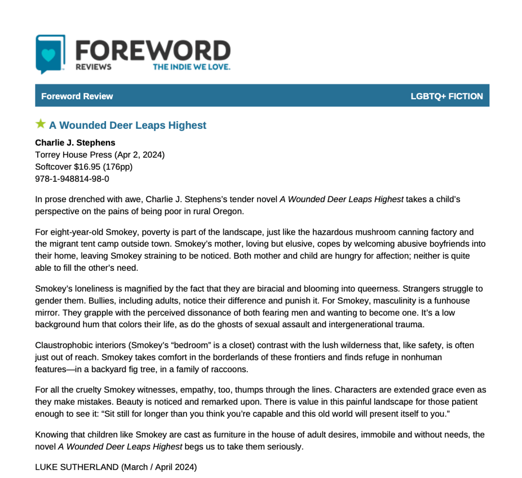 “A Wounded Deer Leaps Highest” was published by Torrey House Press in April 2024. It was long-listed for The Center For Fiction’s 2024 First Novel Prize, and was a finalist for the Oregon Book Awards/Ken Kesey Award for Fiction. It is also a finalist for the Foreword Indies Award. In 2025 it was awarded Publishing Triangle’s Leslie Feinberg Award for Transgender and Gender-Variant Literature. Their new collection of short stories will be published by Buckman Publishing in early March, 2026.